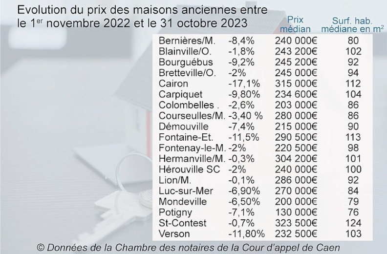 Consultez ici les évolutions de prix des maisons anciennes des alentours de Caen pour la période du 1 novembre 2022 au 31 octobre 2023, établie par la chambre des notaires de la cour d'appel de Caen.