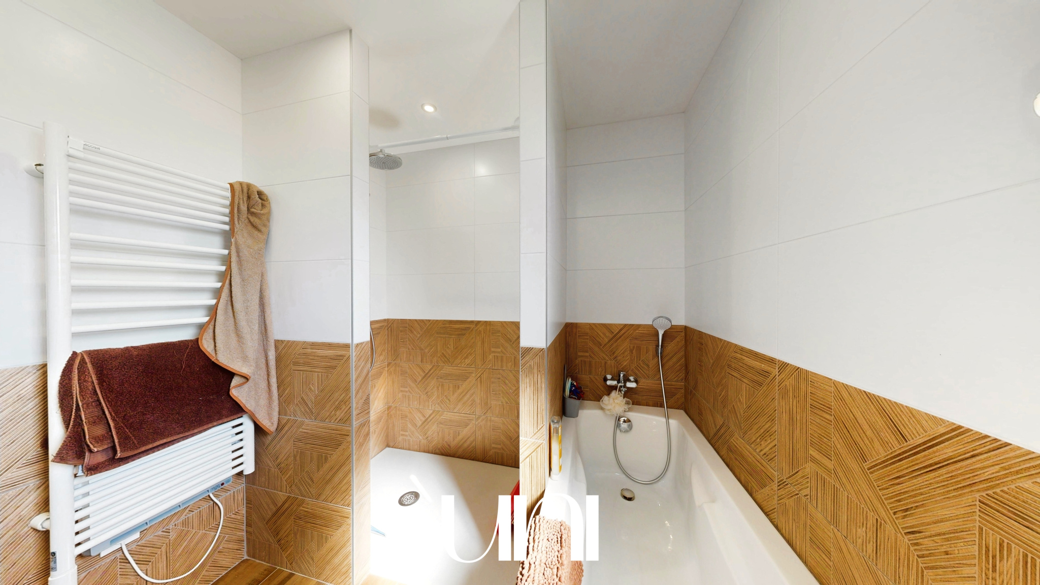 - Une salle de bain avec douche et baignoire
