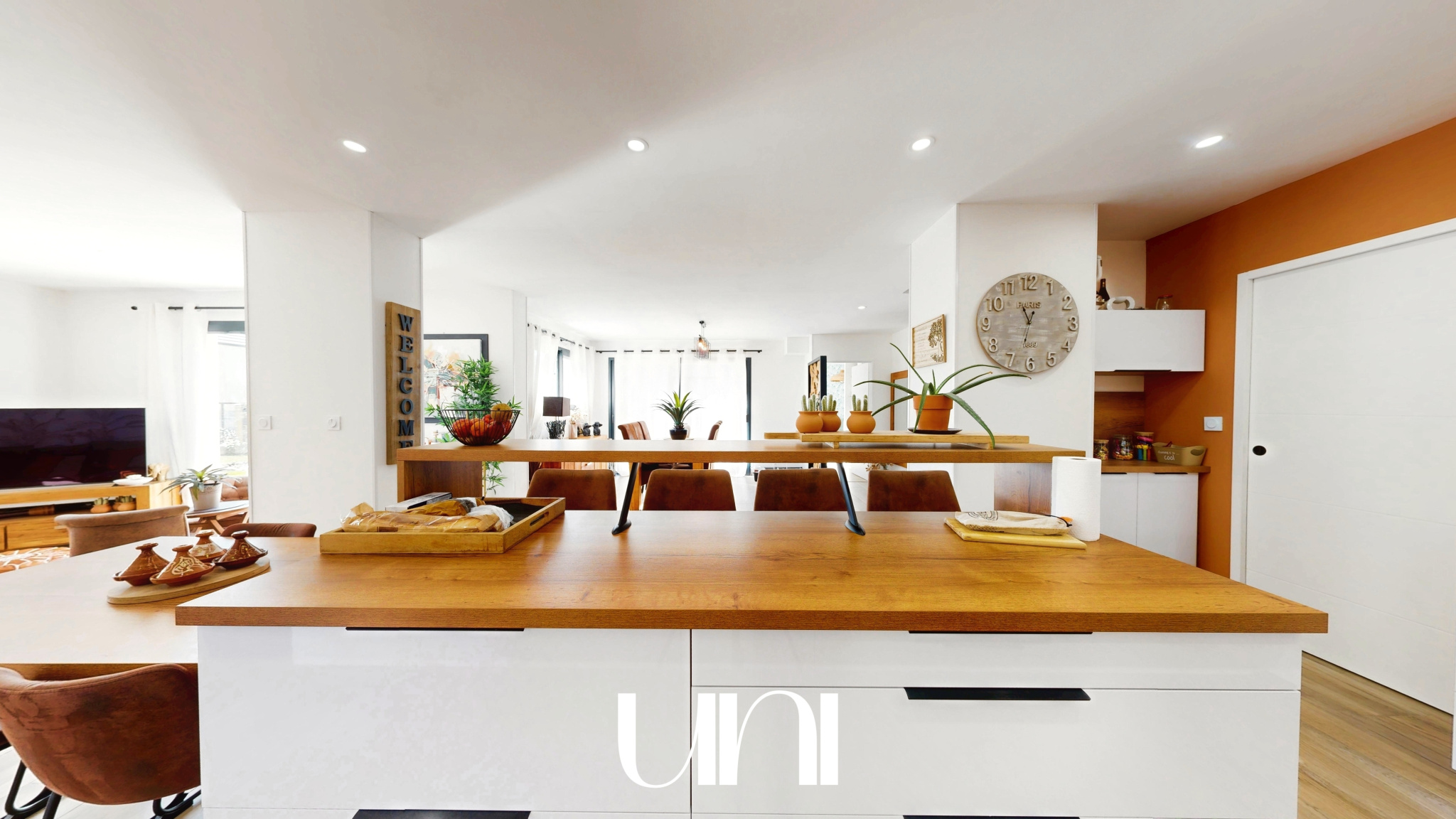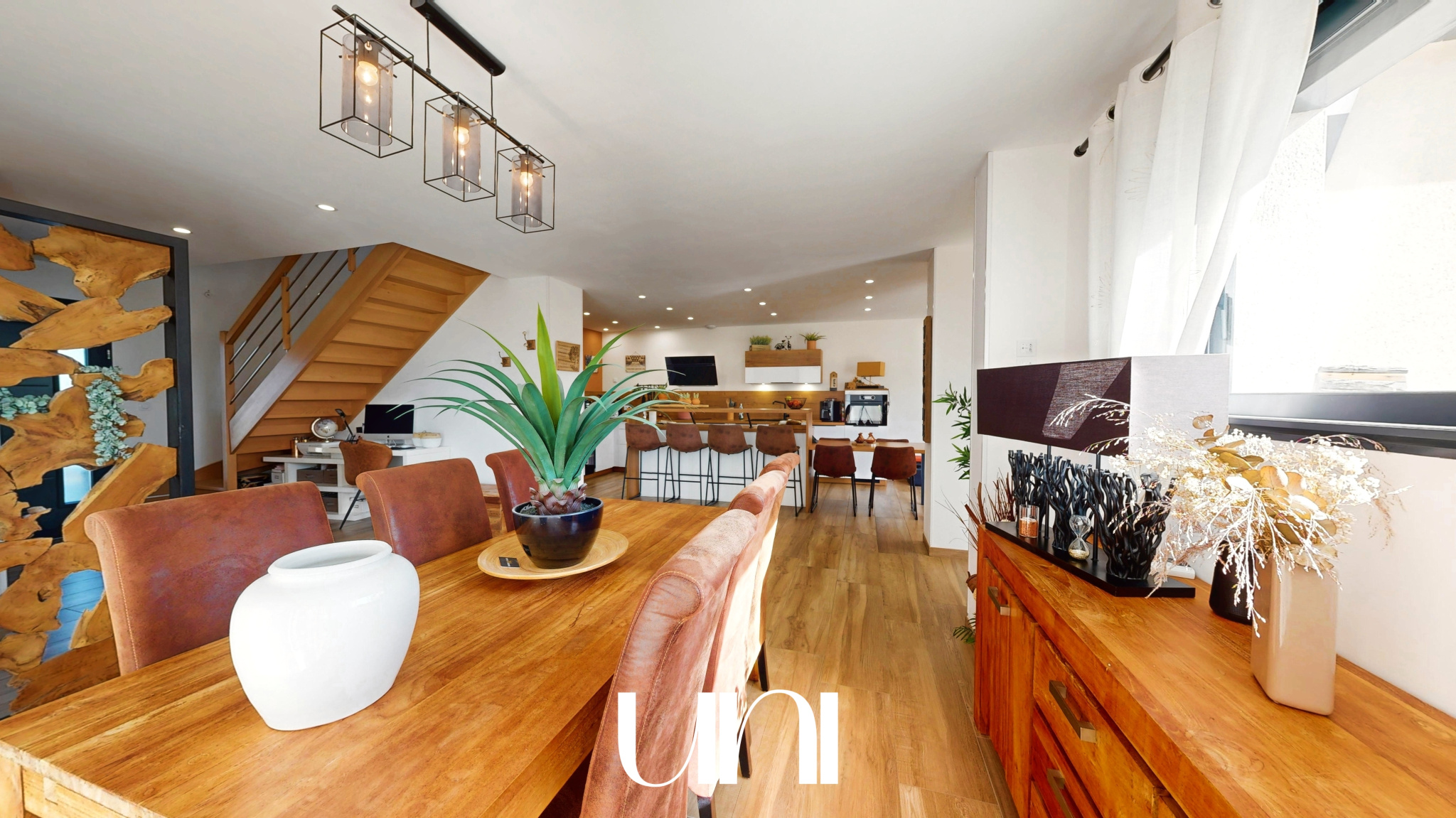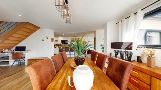 - Une grande pièce de vie avec cuisine ouverte sur la salle à manger et le salon