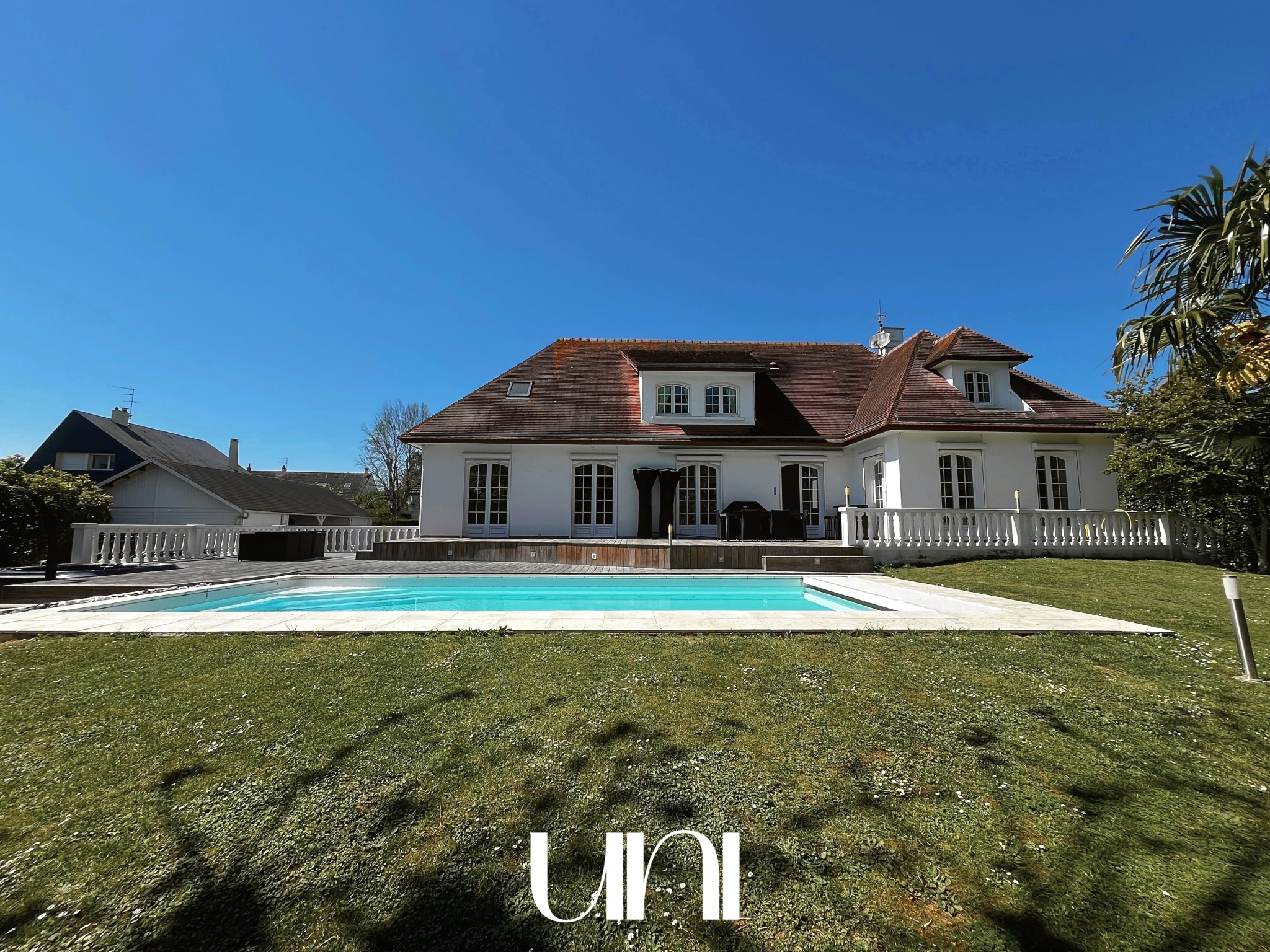 - Grande terrasse et plage de piscine en bois, belle piscine et jacuzzi