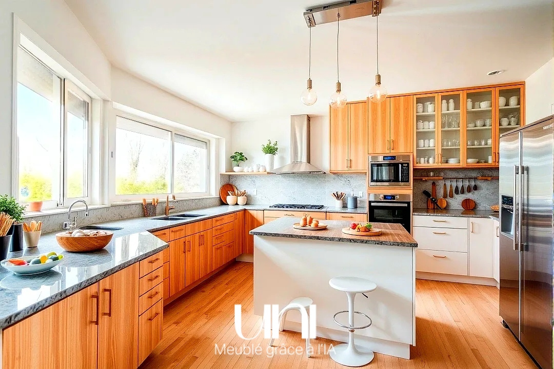 - 1 cuisine avec coin repas, ouvert sur une salle à manger