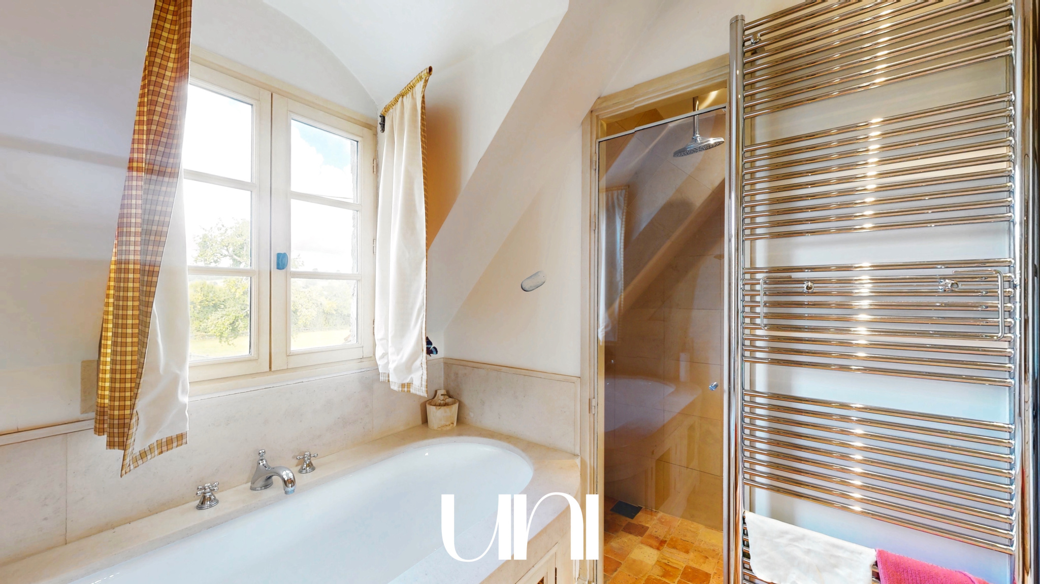 - une salle de bain (douche et baignoire) avec WC