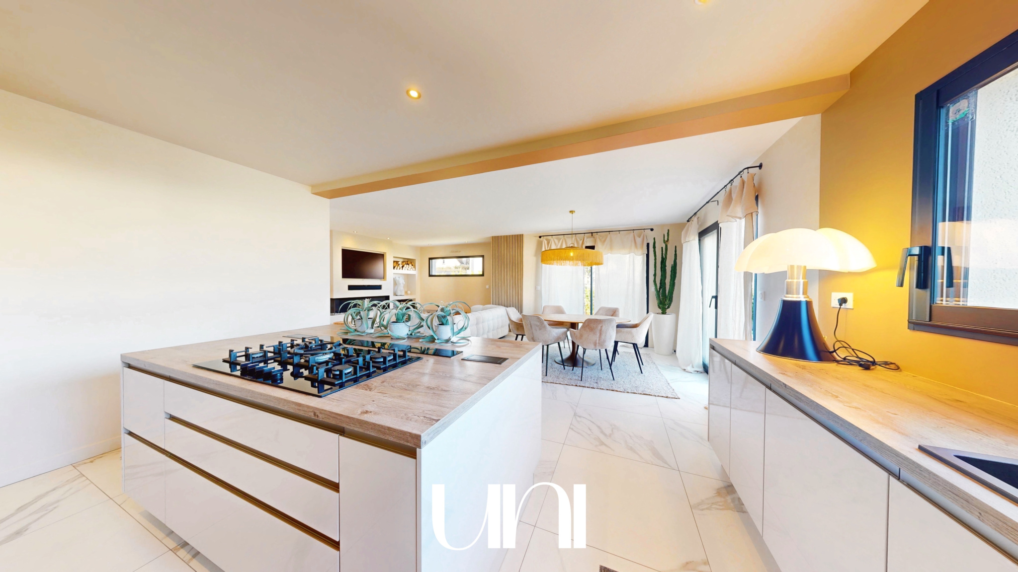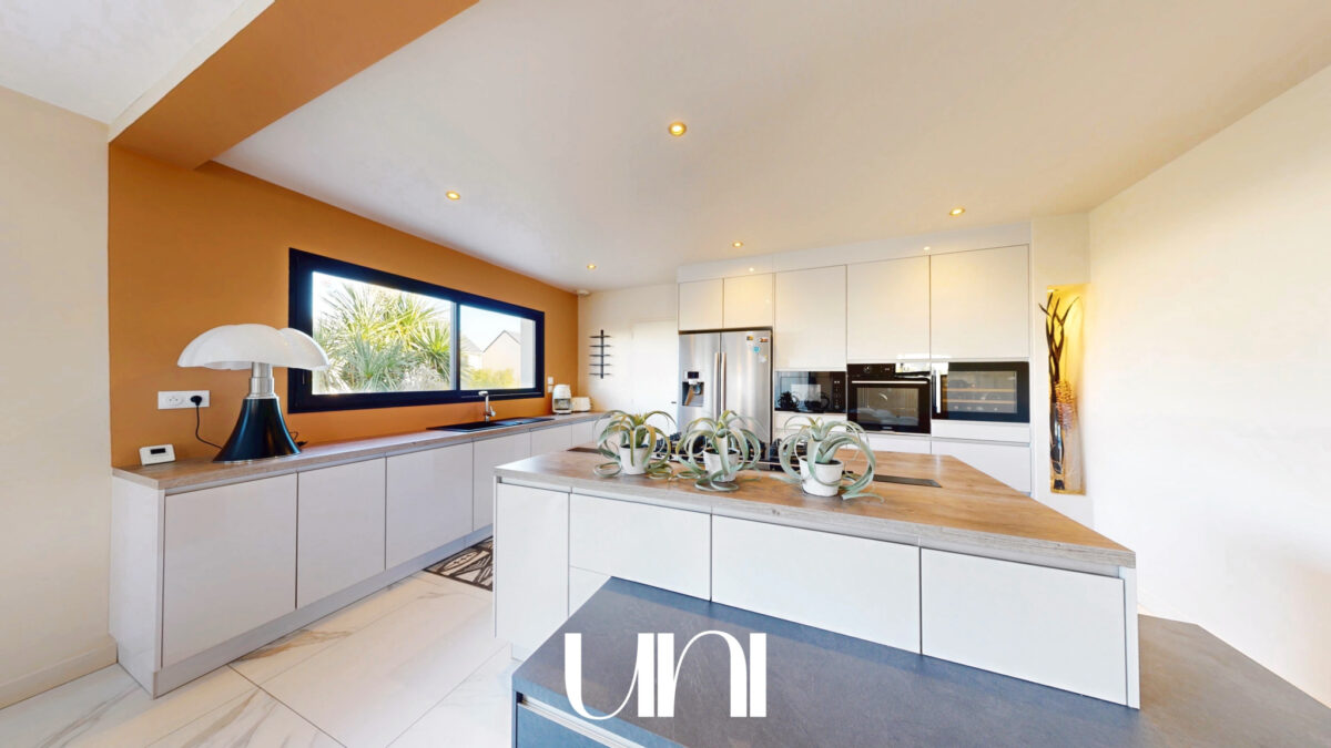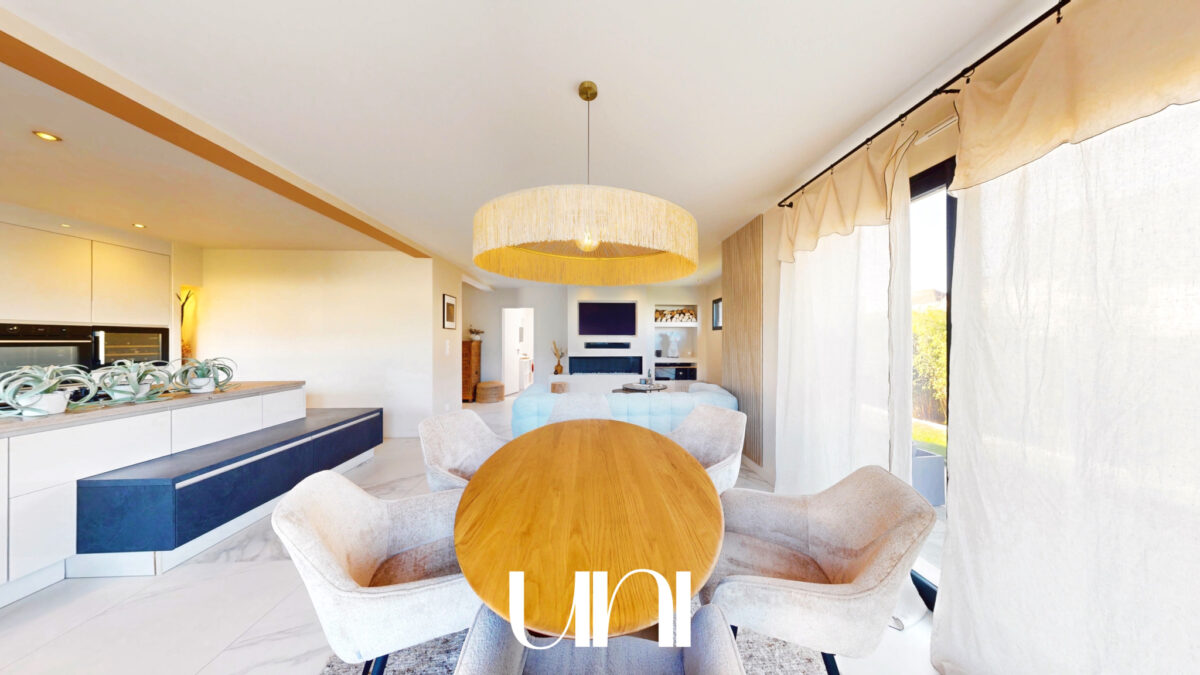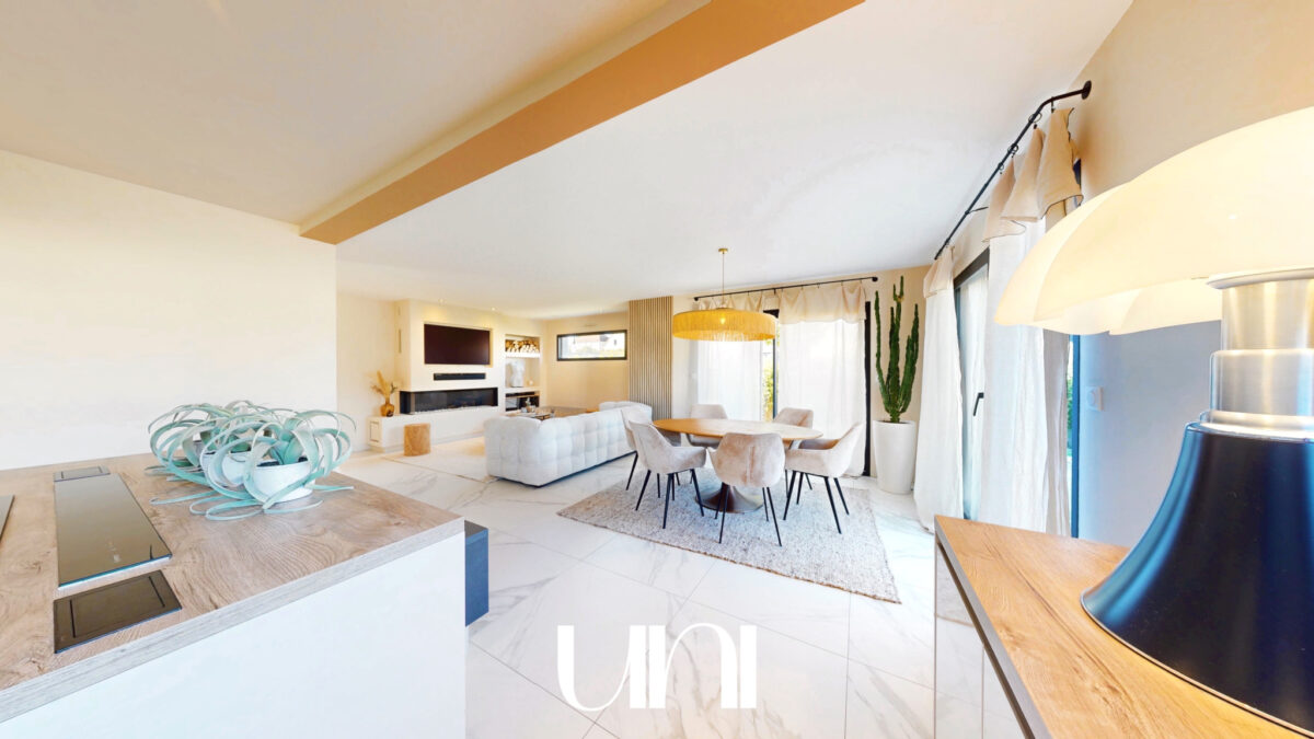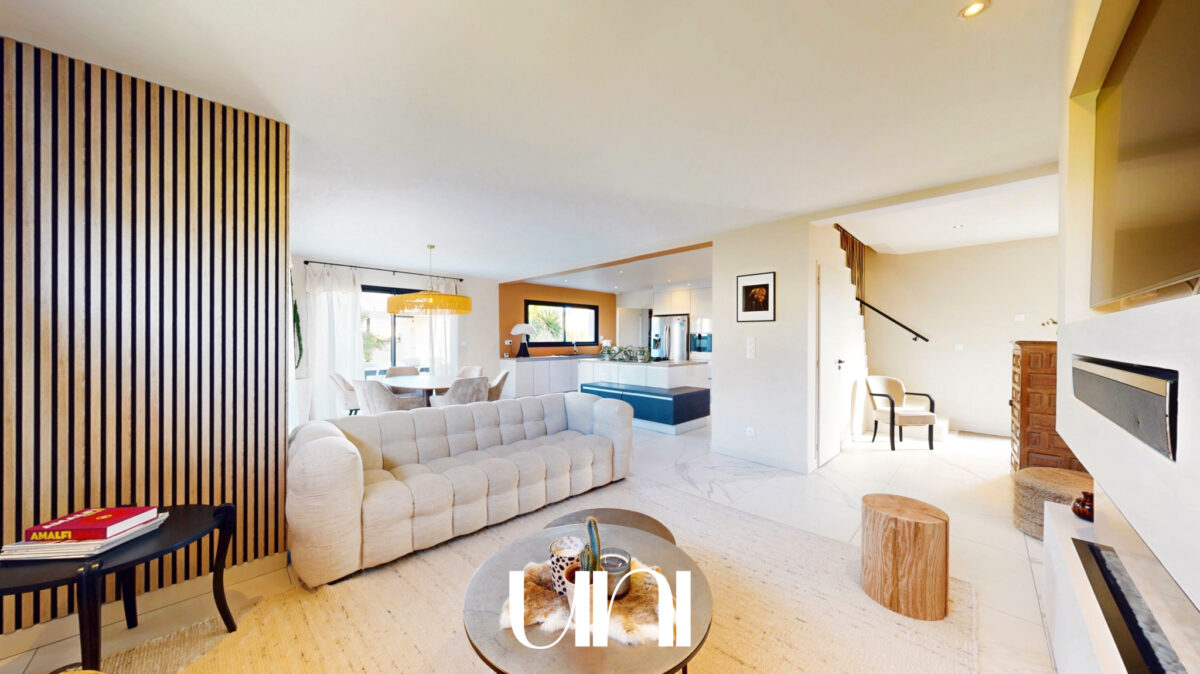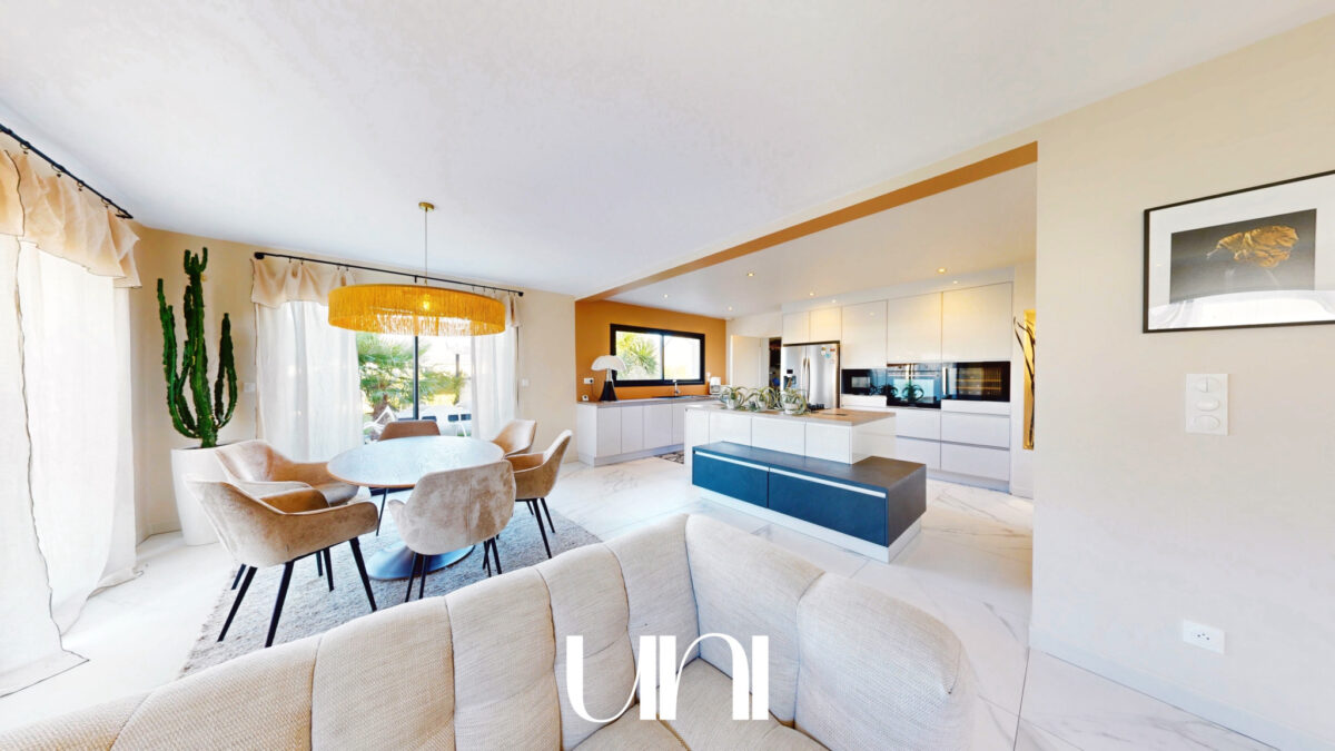 - Une grande pièce de vie avec cuisine ouverte sur la salle à manger et le salon