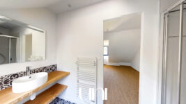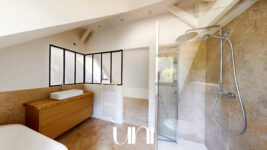 - Au 1er étage : un grand pallier, un wc, une chambre avec salle de douche-baignoire-wc, une chambre avec salle de douche, une chambre avec salle de douche.